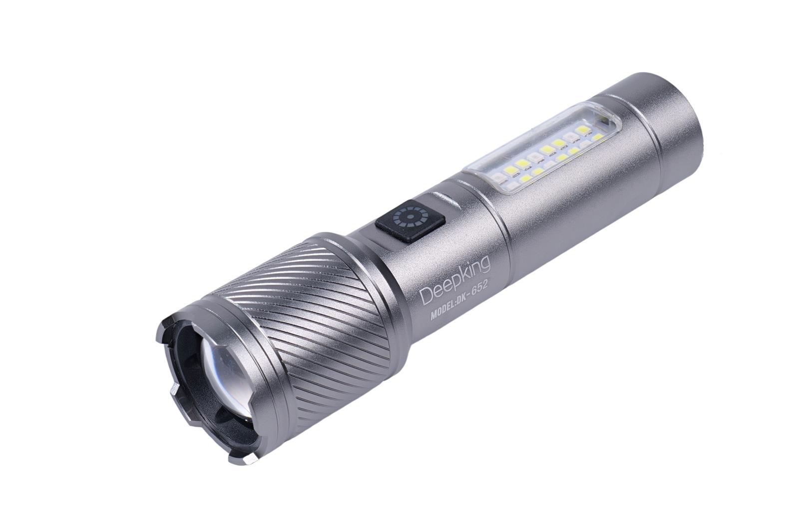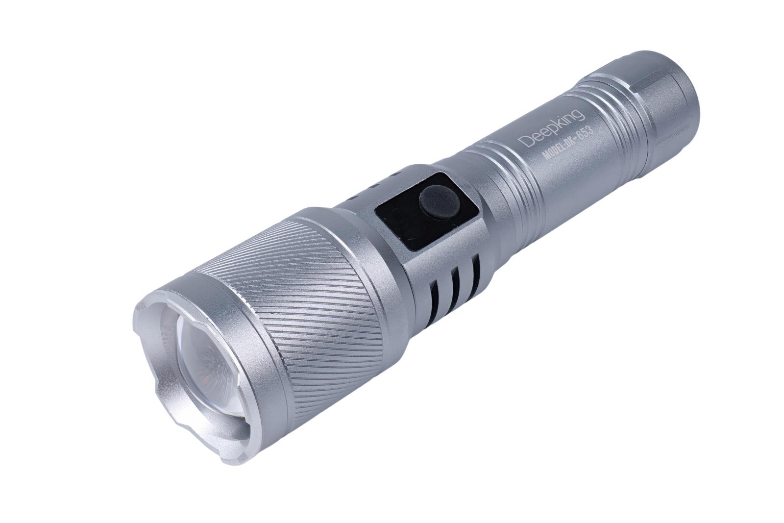 Item No:DK-652 Series:Flashlight Lithium Battery: 2200mah Light power: 5W Ctn/pcs:80 CTN Size: 36.5*36*48CM Color:Silvery